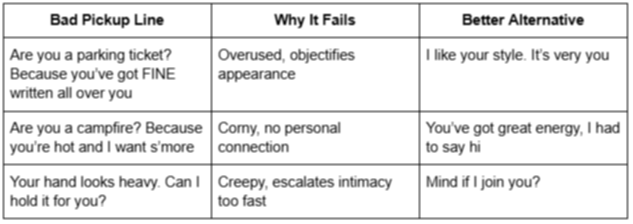 The problem with bad pickup lines isn’t just that they’re cheesy — it’s that they completely miss the point of flirting. Flirting is about building a spark through authenticity, not delivering a rehearsed one-liner that treats someone like a punchline.